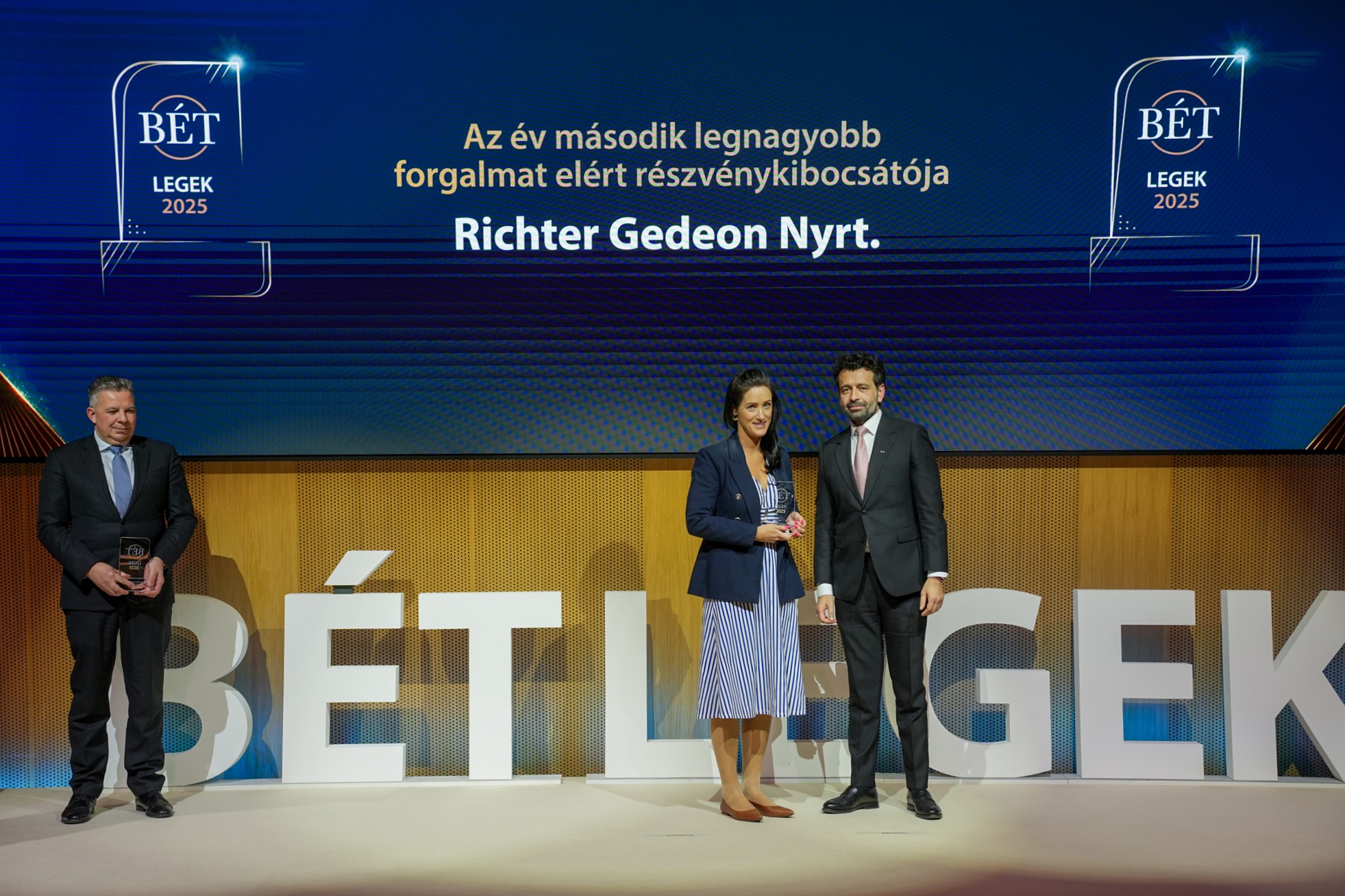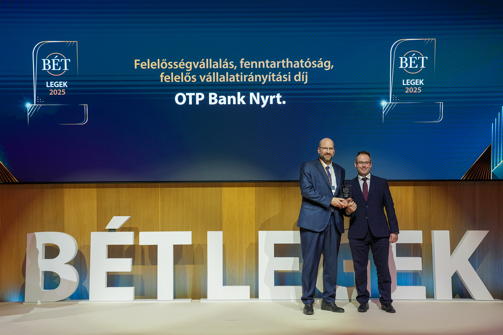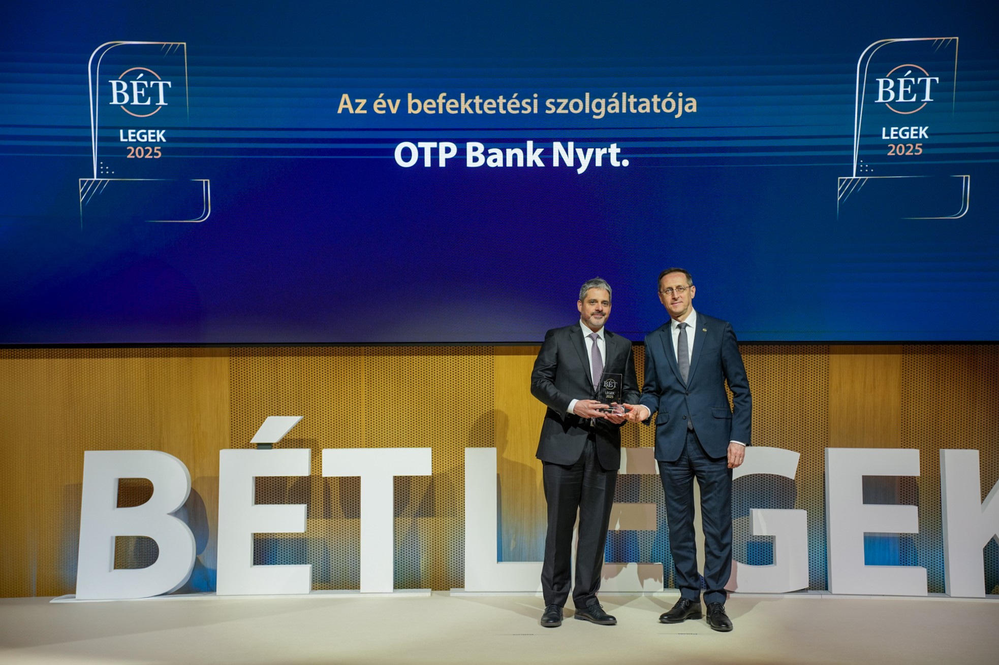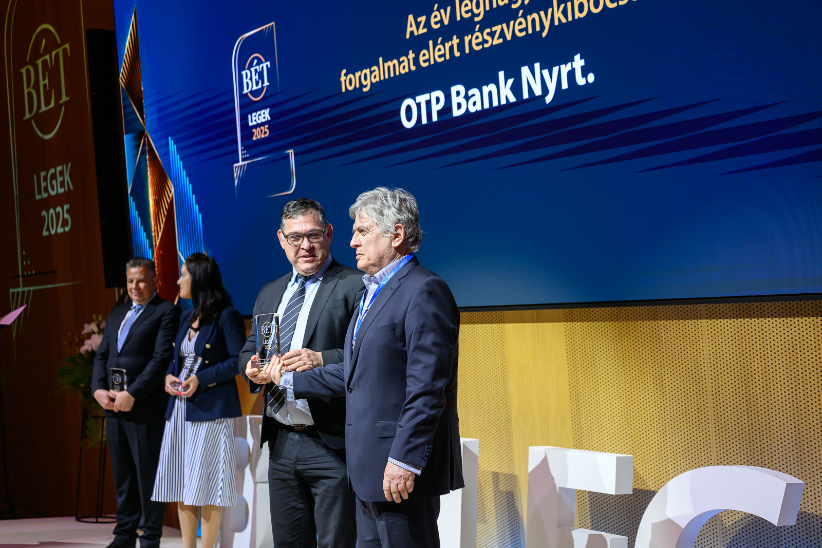 A 2025. évi teljesítménye alapján az OTP Bank kapta a legtöbb elismerést az idei BÉT Legeken, összesen négy díjjal büszkélkedve. A hitelintézet nyerte el „Az év befektetési szolgáltatója”„Az év legnagyobb forgalmat elért részvénykibocsátója”, a „Kibocsátói transzparencia díj” és a „Felelősségvállalás, fenntarthatóság, felelős vállalatirányítási díj” kategóriákat. A legnagyobb forgalmat elért részvénykibocsátók rangsorában az OTP Bankot a Richter Gedeon követte a második, a MOL pedig a harmadik helyen.
